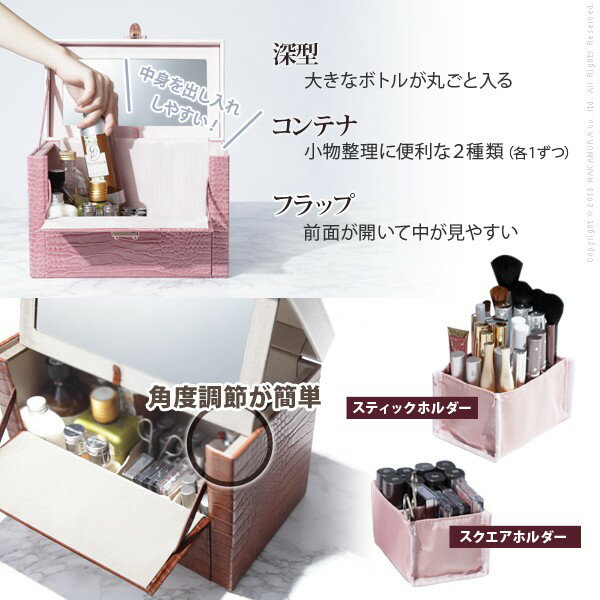 【カラーバリエーション】 ブラウン・ピンク 【仕様】 本体(外貼り):合成皮革(PVC) 本体蓋(外貼り):合成皮革(PVC) 内貼り:ポリエステル100%(撥水加工) 芯材:繊維板 ◎完成品 【サイズ】 幅30.5x奥行19x高さ23cm 重量:約1.4kg 本体内寸:幅29(26.5)x奥行16x高さ18cm ミラーサイズ:幅24x高さ11cm・フチ2cm フラップ部:幅23.5x奥行9cm コンテナ内寸:幅10x奥行7x高さ6.5cm コンテナ(4仕切り1マス):幅約5x奥行約3.5x高さ6.5cm(x4マス) コンテナ(ゴム仕切り):幅約3x奥行約1.2x高さ4cm(x10箇所) 持ち手立ち上がり:3cm 株式会社ナカムラ(A0800028)